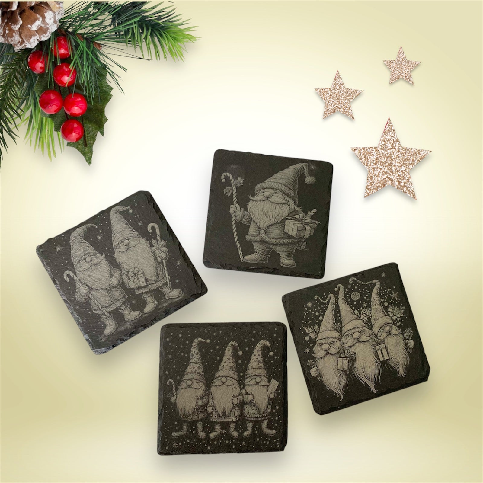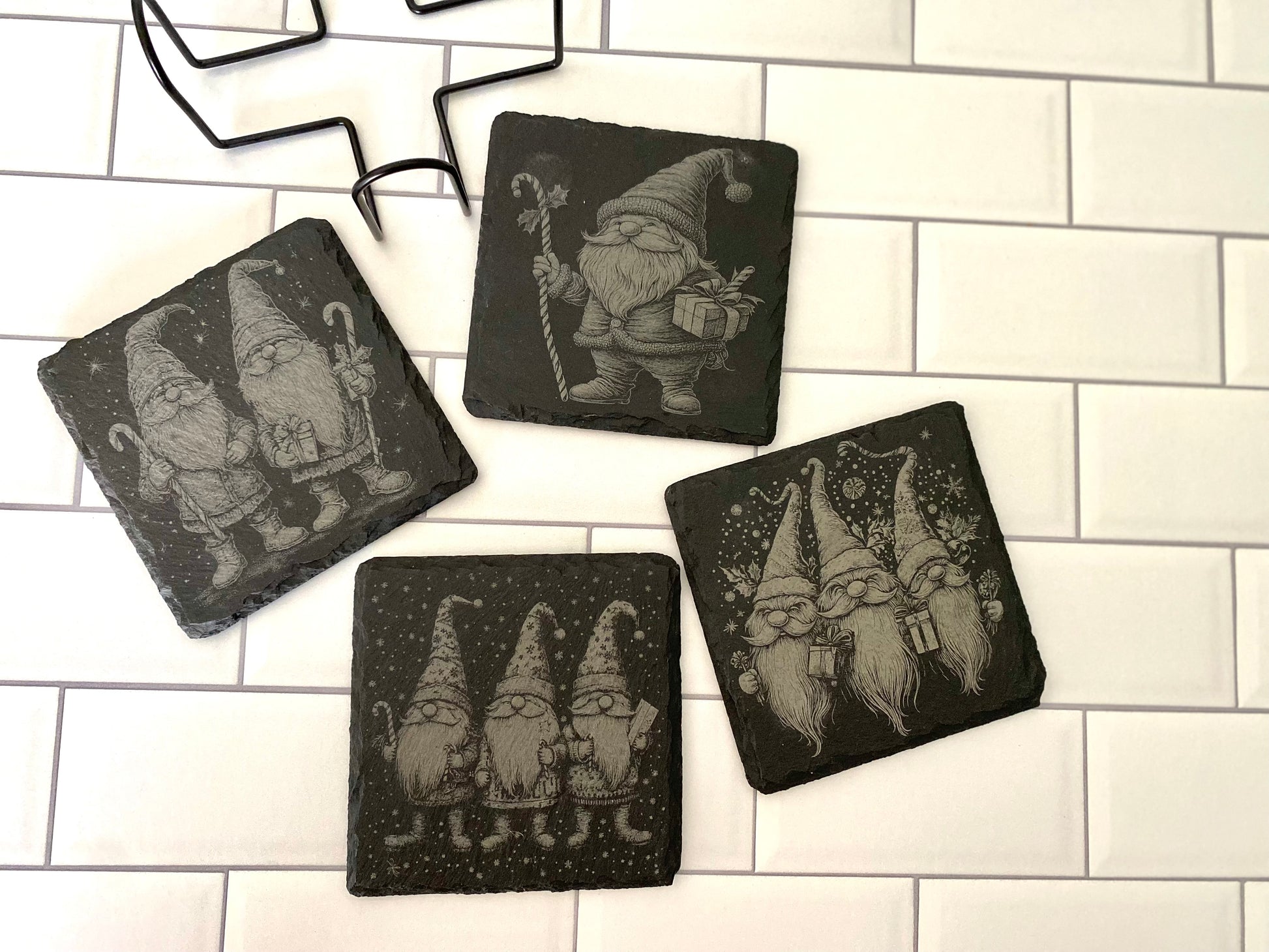 Transform your holiday gatherings with our Set of 4 Slate Christmas Coasters featuring adorable engraved gnome designs!
