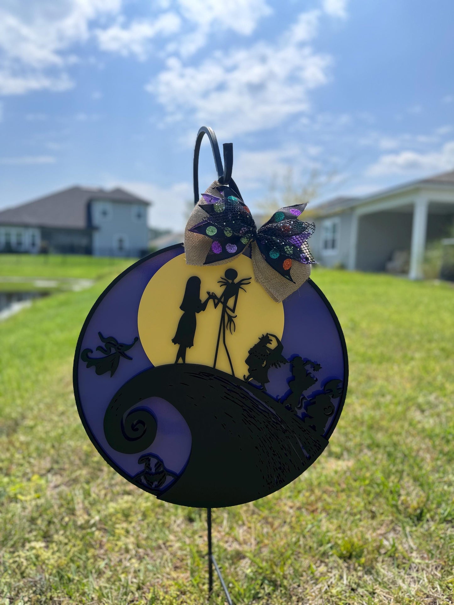 Bring a touch of Halloween Town to your home with our *Nightmare Before Christmas* door hanger. Perfect for fans of the iconic film, this door hanger adds a whimsical, spooky charm to your entryway.